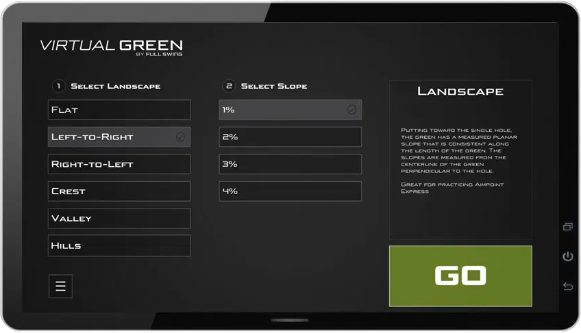 Das virtaul Green wird Mithilfe von einer Reihe von Aktuatorenen unter der Oberfläche, die mit unserem benutzerfreundlichen Touchscreen verbunden sind, gesteuert. Damit kann jegliche Art von Break eingestellt werden. Sie können auch einfach ein Szenario Ihrer Wahl auswählen um Ihre Putts auf verschiedenen Grüns zu üben.